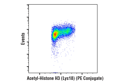 This Cell Signaling Technology antibody is conjugated to phycoerythrin (PE) and tested in-house for direct flow cytometric analysis in human cells. This antibody is expected to exhibit the same species cross-reactivity as the unconjugated Acetyl-Histone H3 (Lys18) (D8Z5H) Rabbit mAb #13998.