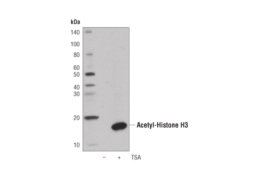 Acetyl-Histone H3 (Lys9) (C5B11) Rabbit Monoclonal Antibody (HRP Conjugate) detects endogenous levels of histone H3 protein only when acetylated on Lys9. This antibody conjugate does not cross-react with other acetylated histones.