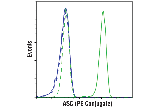 This Cell Signaling Technology antibody is conjugated to phycoerythrin (PE) and tested in-house for direct flow cytometric analysis in human cells. This antibody is expected to exhibit the same species cross-reactivity as the unconjugated ASC/TMS1 (D2W8U) Rabbit mAb #67824.