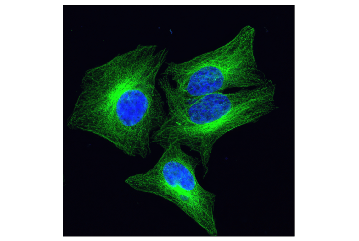 beta-Tubulin (9F3) Rabbit Monoclonal Antibody (Alexa Fluor® 488 Conjugate) detects endogenous levels of total β-tubulin protein and does not cross-react with recombinant α-tubulin.