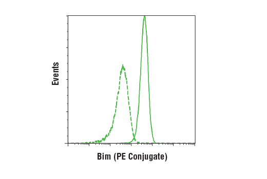 This Cell Signaling Technology antibody is conjugated to phycoerythrin (PE) and tested in-house for direct flow cytometry analysis in human cells. The antibody is expected to exhibit the same species cross-reactivity as the unconjugated Bim (C34C5) Rabbit mAb #2933.