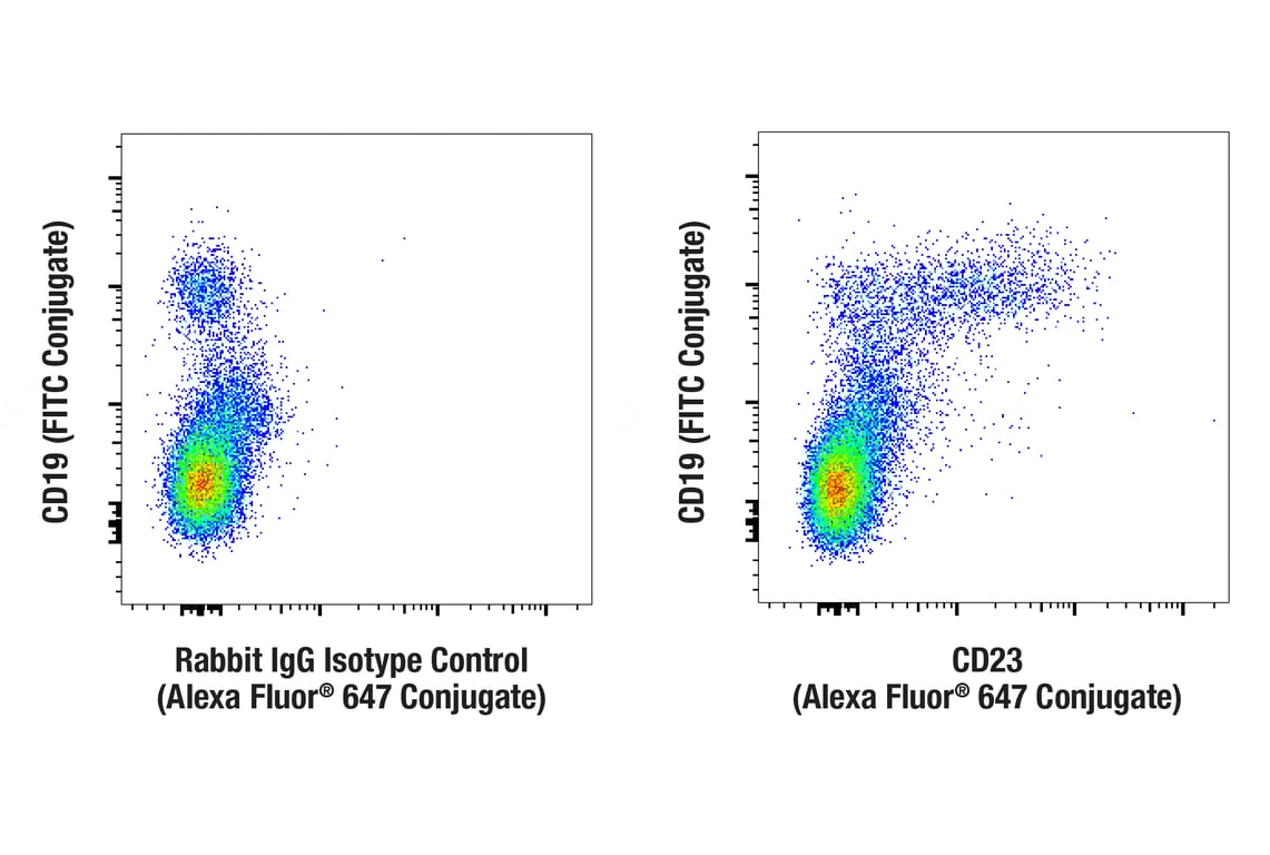 This Cell Signaling Technology® antibody is conjugated to Alexa Fluor® 647 fluorescent dye under optimal conditions. This antibody conjugate is expected to exhibit the same species cross-reactivity as the unconjugated CD23 (E5P8Z) Rabbit mAb #70045.