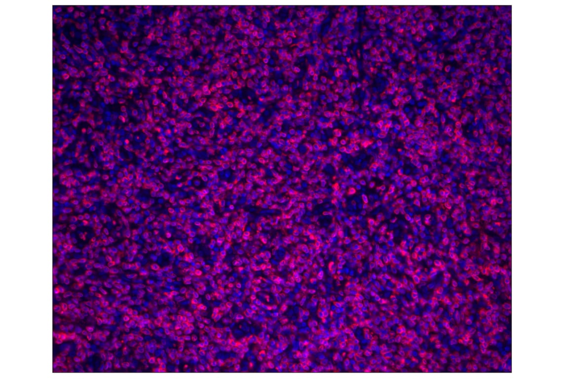 CD3 epsilon (D7A6E) Rabbit Monoclonal Antibody (Alexa Fluor® 555 Conjugate) recognizes endogenous levels of total CD3ε protein. This antibody conjugate recognizes human CD3ε protein and is also reactive with mouse CD3ε; however, this antibody conjugate is not suggested for immunohistochemical analysis of mouse tissues.