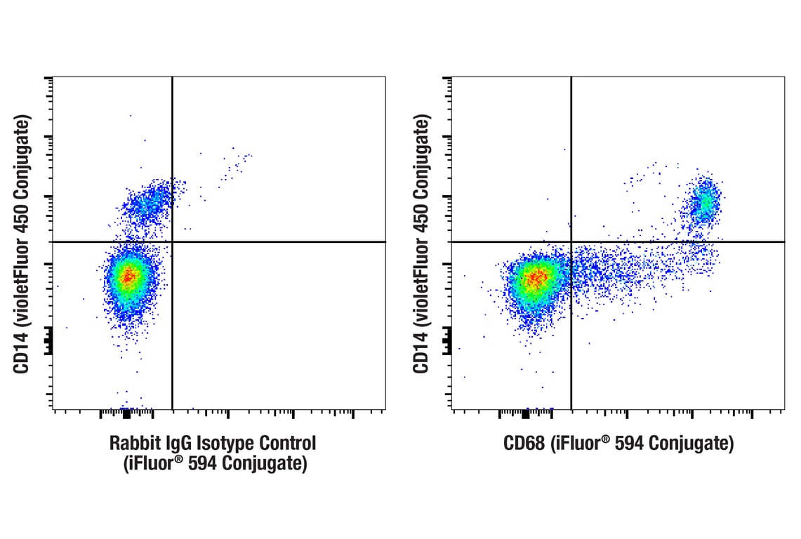 This Cell Signaling Technology® antibody is conjugated to iFluor® 594 fluorescent dye under optimal conditions. This antibody conjugate is expected to exhibit the same species cross-reactivity as the unconjugated CD68 (D4B9C) XP® Rabbit mAb #76437.