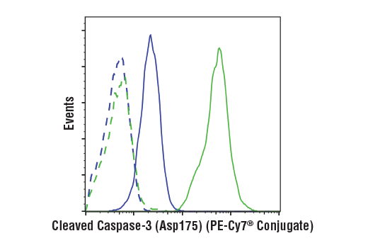 Cleaved Caspase-3 (Asp175) (D3E9) Rabbit Monoclonal Antibody (PE-Cy7® Conjugate) recognizes endogenous levels of caspase-3 protein only when cleaved at Asp175. This antibody conjugate is preferred for immunofluorescence, flow cytometry, and immunohistochemistry applications. This antibody conjugate detects non-specific caspase substrates by western blot. Non-specific labeling may be observed by immunofluorescence in specific sub-types of healthy cells in fixed-frozen tissues (e.g. pancreatic alpha-cells). Nuclear background may be observed in rat and monkey samples.
