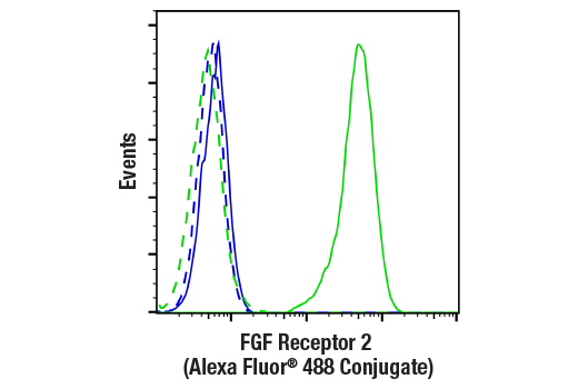 This Cell Signaling Technology antibody is conjugated to Alexa Fluor® 488 fluorescent dye under optimal conditions and tested in-house for direct flow cytometric analysis in human cells. This antibody conjugate is expected to exhibit the same species cross-reactivity as the unconjugated FGF Receptor 2 (D4L2V) Rabbit mAb #23328.