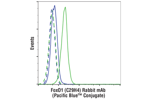 FoxO1 (C29H4) Rabbit Monoclonal Antibody (Pacific Blue™ Conjugate) detects endogenous levels of total FoxO1 protein. This antibody conjugate does not detect exogenously expressed family members FoxO3a or FoxO4.