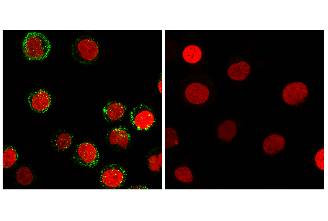 This Cell Signaling Technology antibody is conjugated to Alexa Fluor® 488 fluorescent dye under optimal conditions and tested in-house for direct flow cytometric analysis in human cells. This antibody conjugate is expected to exhibit the same reactivity as the unconjugated G4S Linker (E7O2V) Rabbit mAb #71645, which is expected to react with cell surface-expressed CARs of varying specificity containing a G4S linker within the scFv of the extracellular domain.