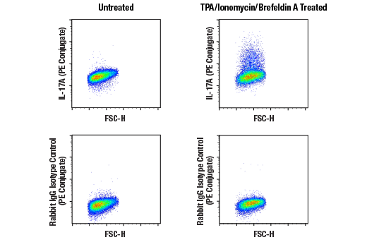 This Cell Signaling Technology antibody is conjugated to phycoerythrin (PE) and tested in-house for direct flow cytometry analysis in mouse cells. This antibody is expected to exhibit the same species cross-reactivity as the unconjugated IL-17A (D1X7L) Rabbit mAb #13838.