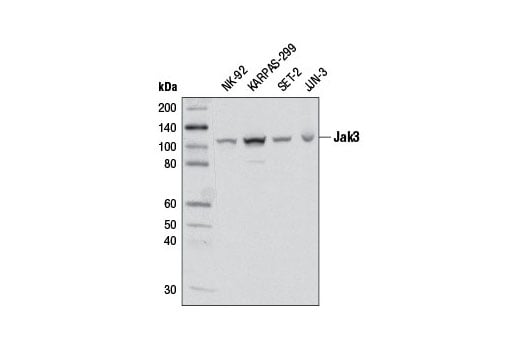 Jak3 (D1H3) Rabbit Monoclonal Antibody (Biotinylated) recognizes endogenous levels of total Jak3 protein.