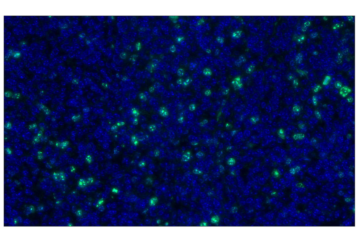 Ki-67 (D3B5) Rabbit Monoclonal Antibody (Alexa Fluor® 488 Conjugate) recognizes endogenous levels of total Ki-67 protein by Flow Cytometry. This antibody conjugate lacks sensitivity in low-expressing cells by immunofluorescence but may be used to detect moderate-to-high levels of Ki-67 in cultured cells and frozen tissues. Species reactivity for IHC-P is mouse only.