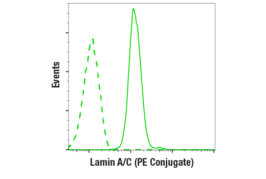 This Cell Signaling Technology antibody is conjugated to phycoerythrin (PE) and tested in-house for direct flow cytometry analysis in human cells. This antibody is expected to exhibit the same species cross-reactivity as the unconjugated Lamin A/C (4C11) Mouse mAb #4777.