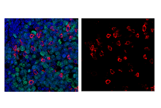 This Cell Signaling Technology antibody is conjugated to Alexa Fluor® 555 fluorescent dye and tested in-house for direct immunofluorescent analysis in mouse tissue and cells. This antibody is expected to exhibit the same species cross-reactivity as the unconjugated PD-1 (Intracellular Domain) (D7D5W) XP® Rabbit mAb #84651.