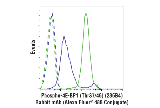 Cell Signaling Technology antibody conjugated to Alexa Fluor® 488 fluorescent dye and tested in-house for direct flow cytometric analysis of human cells. The unconjugated antibody, #2855, reacts with Phospho-4E-BP1 (Thr37/46) from human, mouse, rat and monkey. CST expects that phospho-4E-BP1 (Thr37/46) (236B4) Rabbit mAb (Alexa Fluor® 488 Conjugate) will also recognize Phospho-4E-BP1 in these species.