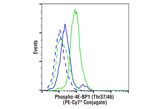 Phospho-4E-BP1 (Thr37/46) (236B4) Rabbit Monoclonal Antibody (PE-Cy7® Conjugate) detects endogenous levels of 4E-BP1 only when phosphorylated at Thr37 and/or Thr46. This antibody conjugate may cross-react with 4E-BP2 and 4E-BP3 when phosphorylated at equivalent sites. Non-specific staining has been observed in mitotic cells by immunofluorescence.