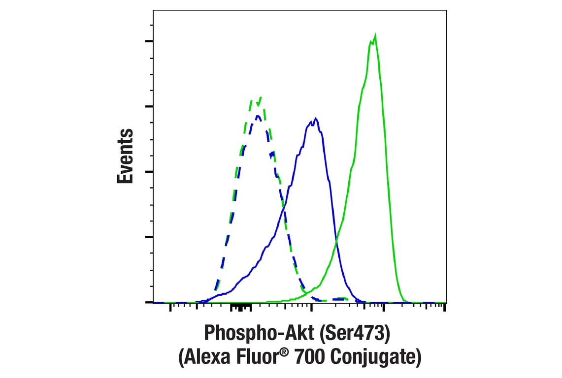 Phospho-Akt (Ser473) (D9E) Rabbit Monoclonal Antibody (Alexa Fluor® 700 Conjugate) detects endogenous levels of Akt1 only when phosphorylated at Ser473. This antibody conjugate also recognizes Akt2 and Akt3 when phosphorylated at the corresponding residues.