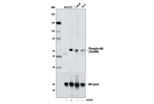 Phospho-Akt (Thr308) (D25E6) Rabbit Monoclonal Antibody (Biotinylated) recognizes endogenous levels of Akt1 protein only when phosphorylated at Thr308. This antibody also recognizes endogenous levels of Akt2 protein when phosphorylated at Thr309 or Akt3 protein when phosphorylated at Thr305.