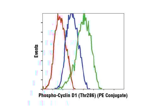 Phospho-Cyclin D1 (Thr286) (D29B3) Rabbit Monoclonal Antibody (PE Conjugate) detects endogenous levels of cyclin D1 only when phosphorylated at Thr286. This antibody conjugate does not cross-react with other cyclin D family members.