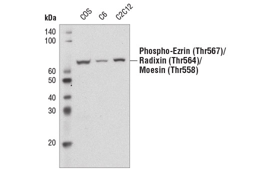 Phospho-Ezrin (Thr567)/Radixin (Thr564)/Moesin (Thr558) (41A3) Rabbit Monoclonal Antibody (Biotinylated) recognizes endogenous levels of ezrin, radixin and moesin only when phosphorylated at Thr567, 564 or 558, respectively. This antibody does not cross-react with related phospho-proteins such as merlin or band 4.1.