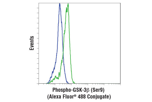 This Cell Signaling Technology antibody is conjugated to Alexa Fluor® 488 fluorescent dye and tested in-house for direct flow cytometric analysis in human cells. This antibody is expected to exhibit the same species cross-reactivity as the unconjugated Phospho-GSK-3β (Ser9) (D85E12) XP® Rabbit mAb #5558.