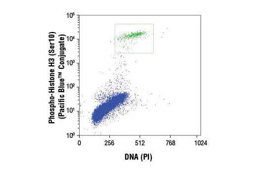This Cell Signaling Technology antibody is conjugated to Pacific Blue™ fluorescent dye and tested in-house for direct flow cytometry in human cells. The antibody is expected to exhibit the same species cross-reactivity as the unconjugated Phospho-Histone H3 (Ser10) (D2C8) XP® Rabbit mAb #3377.
