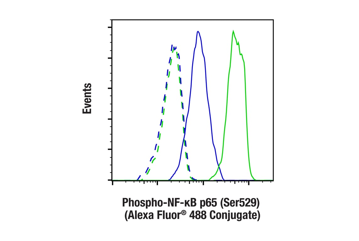 Phospho-NF-kappaB p65 (Ser529) (E3K3J) Rabbit Monoclonal Antibody (Alexa Fluor® 488 Conjugate) recognizes endogenous levels of NF-κB p65 protein only when phosphorylated at Ser529.
