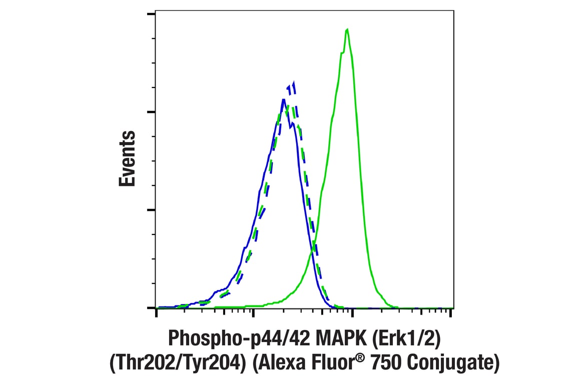 This Cell Signaling Technology® antibody is conjugated to Alexa Fluor® 750 fluorescent dye under optimal conditions and tested in-house for direct flow cytometric analysis in human cells. This antibody conjugate is expected to exhibit the same species cross-reactivity as the unconjugated Phospho-p44/42 MAPK (Erk1/2) (Thr202/Tyr204) (197G2) Rabbit mAb #4377.