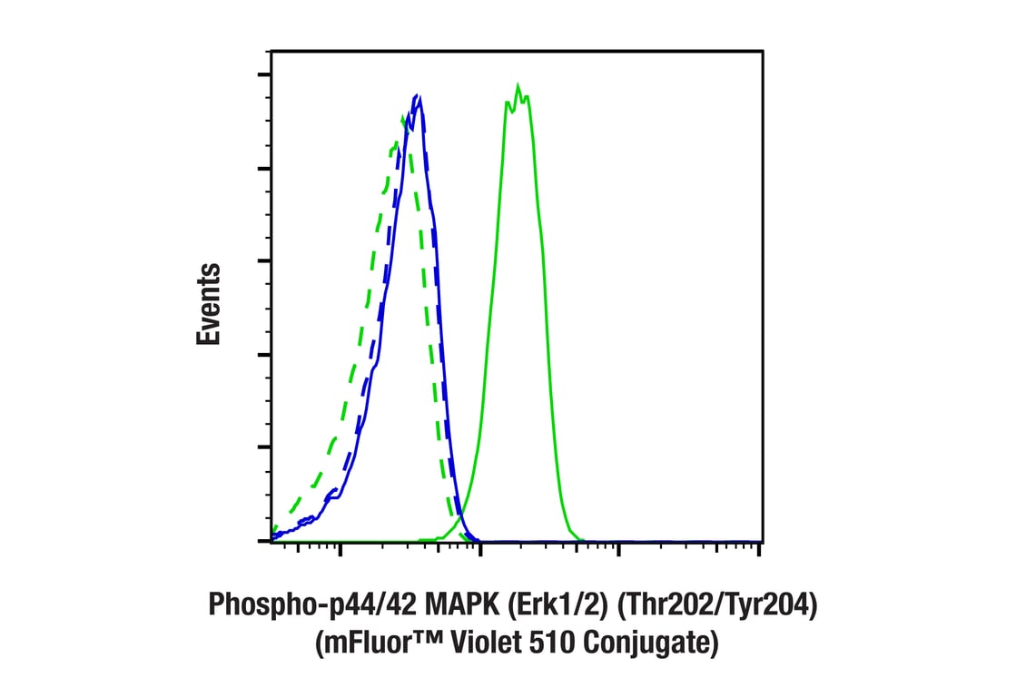 Phospho-p44/42 MAPK (Erk1/2) (Thr202/Tyr204) (197G2) Rabbit Monoclonal Antibody (mFluor™ Violet 510 Conjugate) detects endogenous levels of p44 and p42 MAP Kinase (Erk1 and Erk2) when dually phosphorylated at Thr202 and Tyr204 of Erk1 (Thr185 and Tyr187 of Erk2), and singly phosphorylated at Tyr204. This antibody conjugate does not cross-react with the corresponding phosphorylated residues of either JNK/SAPK or p38 MAP kinase.