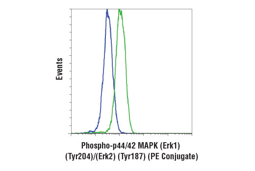 This Cell Signaling Technology antibody is conjugated to phycoerythrin (PE) and tested in-house for direct flow cytometry analysis in human cells. This antibody is expected to exhibit the same species cross-reactivity as the unconjugated Phospho-p44/42 MAPK (Erk1) (Tyr204)/(Erk2) (Tyr187) (D1H6G) Mouse mAb #5726.