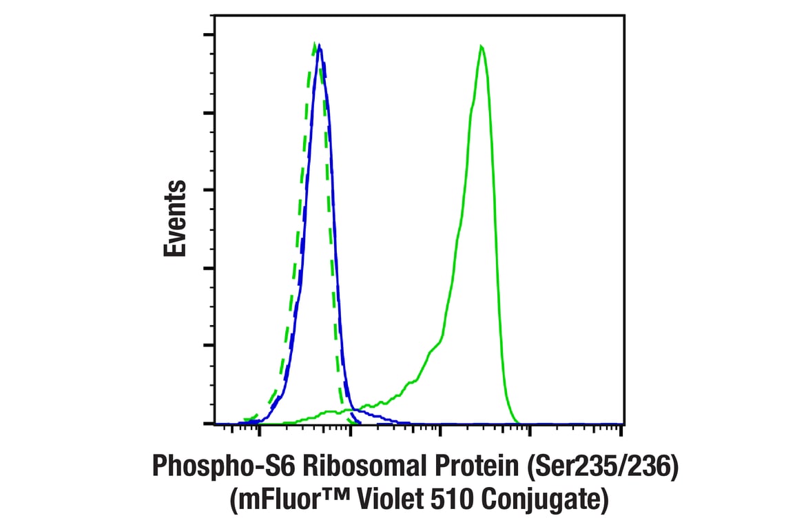 Phospho-S6 Ribosomal Protein (Ser235/236) (D57.2.2E) Rabbit Monoclonal Antibody (mFluor™ Violet 510 Conjugate) detects endogenous levels of S6 ribosomal protein only when phosphorylated at Ser235 and 236. Non-specific labeling in pancreatic islets has been observed by immunofluorescence in fixed frozen mouse tissue post-processed with λ phosphatase.