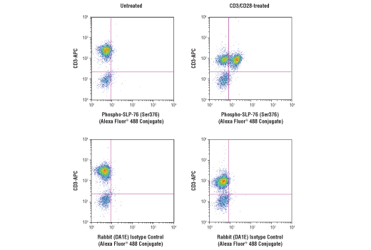 Phospho-SLP-76 (Ser376) (D7S1K) Rabbit Monoclonal Antibody (Alexa Fluor® 488 Conjugate) recognizes endogenous levels of SLP-76 protein only when phosphorylated at Ser376. Clone E3G9U is more sensitive by flow cytometry than clone D7S1K.