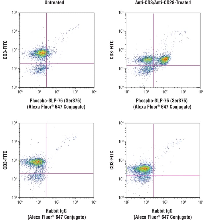 Phospho-SLP-76 (Ser376) (D7S1K) Rabbit Monoclonal Antibody (Alexa Fluor® 647 Conjugate) recognizes endogenous levels of SLP-76 protein only when phosphorylated at Ser376. Clone E3G9U is more sensitive by flow cytometry than clone D7S1K.