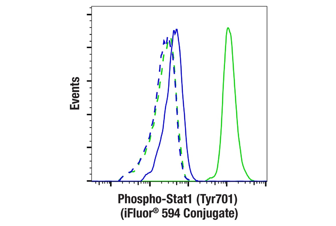 Phospho-Stat1 (Tyr701) (58D6) Rabbit Monoclonal Antibody (iFluor® 594 Conjugate) detects endogenous levels of Stat1 only when phosphorylated at Tyr701. This antibody conjugate detects phosphorylated Tyr701 of p91 Stat1 and also the p84 splice variant. This antibody conjugate does not cross-react with the corresponding phospho-tyrosines of other Stat proteins.