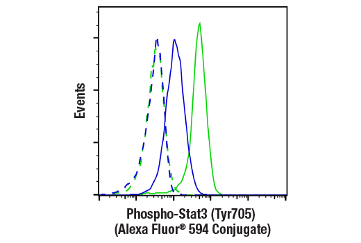 Phospho-Stat3 (Tyr705) (D3A7) Rabbit Monoclonal Antibody (Alexa Fluor® 594 Conjugate) detects endogenous levels of Stat3 only when phosphorylated at tyrosine 705. This antibody conjugate does not cross-react with phospho-EGFR or the corresponding phospho-tyrosines of other Stat proteins.