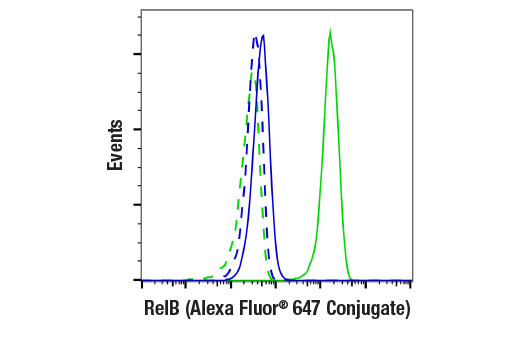 This Cell Signaling Technology antibody is conjugated to Alexa Fluor® 647 fluorescent dye and tested in-house for direct flow cytometric analysis in human cells. This antibody is expected to exhibit the same species cross-reactivity as the unconjugated RelB (D7D7W) Rabbit mAb #10544.