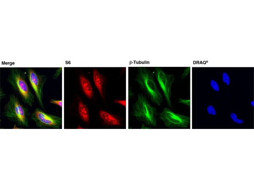 S6 Ribosomal Protein (54D2) Mouse mAb (Alexa Fluor® 555 Conjugate) detects endogenous levels of total S6 ribosomal protein independent of phosphorylation.