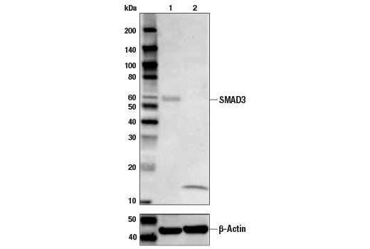SMAD3 (C67H9) Rabbit Monoclonal Antibody (Biotinylated) detects endogenous levels of total SMAD3 protein. No cross-reactivity was detected with other family members.