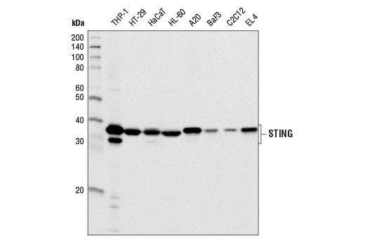 This Cell Signaling Technology antibody is conjugated to biotin under optimal conditions. The biotinylated antibody is expected to exhibit the same species cross-reactivity as the unconjugated STING (D2P2F) Rabbit mAb #13647.