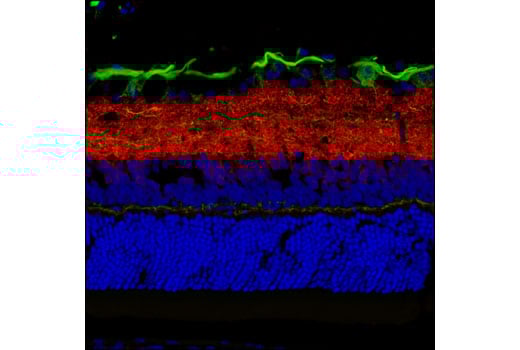 This Cell Signaling Technology antibody is conjugated to Alexa Fluor® 594 fluorescent dye and tested in-house for direct immunofluorescent analysis in mouse and rat tissue. This antibody is expected to exhibit the same species cross-reactivity as the unconjugated Synapsin-1 (D12G5) XP® Rabbit mAb #5297.