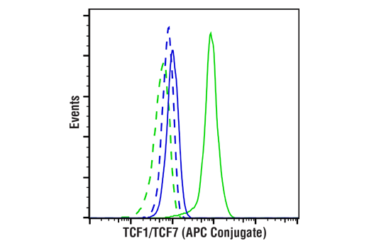 TCF1/TCF7 (C63D9) Rabbit Monoclonal Antibody (APC Conjugate) detects endogenous levels of total TCF1/TCF7 protein. This antibody conjugate does not recognize the dominant negative isoforms of TCF1/TCF7 lacking the amino-terminal β-catenin binding domain and does not cross-react with LEF1.