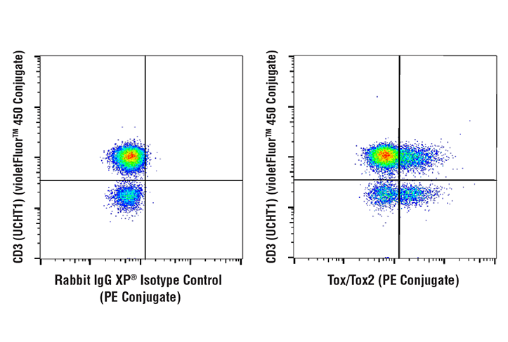 This Cell Signaling Technology antibody is conjugated to phycoerythrin (PE) and tested in-house for direct flow cytometric analysis in human cells. This antibody is expected to exhibit the same species cross-reactivity as the unconjugated Tox/Tox2 (E6G5O) Rabbit mAb #36778.