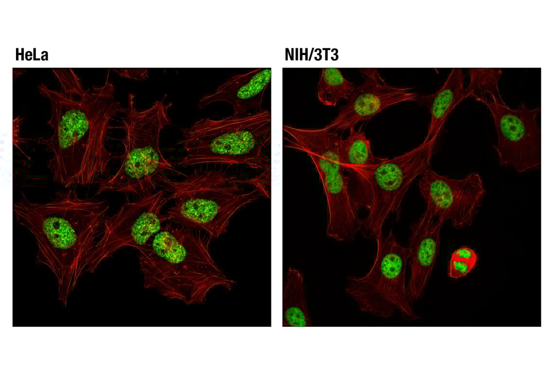 Tri-Methyl-Histone H3 (Lys27) (C36B11) Rabbit Monoclonal Antibody (Alexa Fluor® 488 Conjugate) recognizes endogenous levels of histone H3 only when tri-methylated at Lys27. This antibody conjugate does not cross-react with non-methylated, mono-methylated, or di-methylated Lys27. In addition, this antibody conjugate does not cross-react with mono-methylated, di-methylated, or tri-methylated histone H3 at Lys4, Lys9, Lys36, or Histone H4 at Lys20.