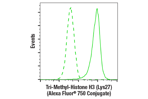 Tri-Methyl-Histone H3 (Lys27) (C36B11) Rabbit Monoclonal Antibody (Alexa Fluor® 750 Conjugate) detects endogenous levels of histone H3 only when tri-methylated on Lys27. This antibody conjugate does not cross-react with non-methylated, mono-methylated, or di-methylated Lys27. In addition, this antibody conjugate does not cross-react with mono-methylated, di-methylated, or tri-methylated histone H3 at Lys4, Lys9, Lys36, or histone H4 at Lys20.