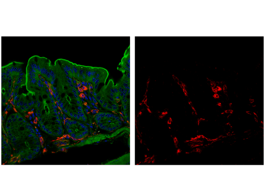 This Cell Signaling Technology antibody is conjugated to Alexa Fluor® 647 fluorescent dye and tested in-house for direct immunofluorescent analysis in mouse tissue. This antibody is expected to exhibit the same species cross-reactivity as the unconjugated VISTA (D5L5T) XP® Rabbit mAb #54979.