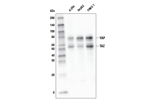 YAP/TAZ (D24E4) Rabbit Monoclonal Antibody (HRP Conjugate) recognizes endogenous levels of total YAP and TAZ proteins.