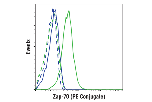 Zap-70 (D1C10E) Rabbit Monoclonal Antibody (PE Conjugate) detects endogenous levels of total Zap-70. This antibody conjugate does not cross-react with other related proteins.