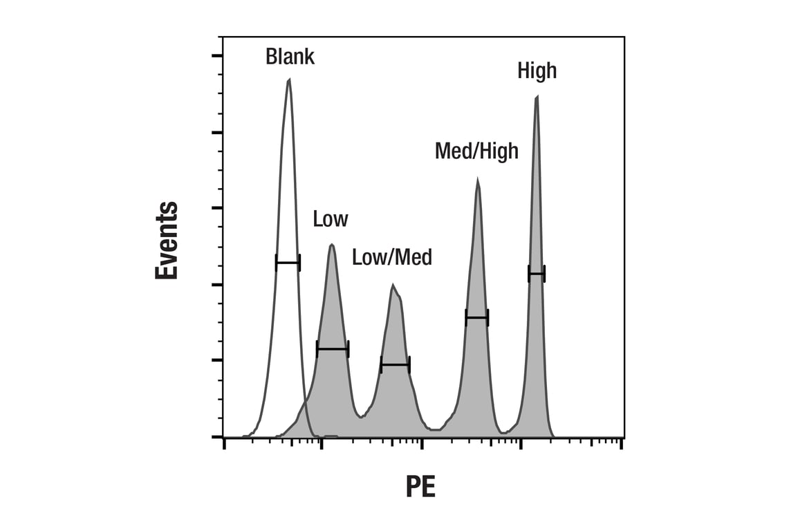 The CAR (Whitlow/218 Linker) Antigen Density Quantitation Kit (PE) enables the quantitative analysis of chimeric antigen receptor (CAR) surface expression on cells that are engineered to express a Whitlow/218 linker-containing single-chain variable fragment (scFv)-based CAR. The kit contains bead populations surface labeled with increasing amounts of phycoerythrin (PE) calibrated in molecules of equivalent soluble fluorochrome (MESF) units. Analyzing the beads on a flow cytometer enables the generation of a calibration curve that relates instrument geometric mean or median fluorescence intensity (MFI) to standardized MESF units. Because the beads are surface labeled with the actual fluorochrome conjugated to the antibodies used to stain cells, the standards are environmentally responsive (e.g., to pH, temperature, etc.). Quantitative assignments are truly relevant when run on the same day, at the same instrument settings (e.g., PMT voltages, compensation), and in the same buffer formulation as the cell samples. The PE-conjugated antibody included in this kit was purified to have an average degree of label (DOL) of approximately 1.0.