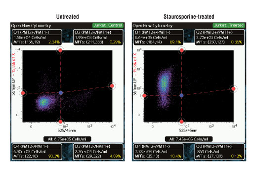 The CellSimple™ Cell Analyzer is a benchtop instrument that utilizes a disposable thin-film cassette and a combination of a 488 nm laser, two photomultiplier tubes (525/45 nm and 561 nm LP filters), Coulter Principle-based cell measurements, and on-board software to provide easy-to-run applications and data analysis. Data acquisition occurs within approximately 10 seconds per test. The instrument relies on disposable cassettes for sample handling, which alleviates the need for flow cell cleaning and fluidics maintenance and the instrument is small enough to be portable between the lab bench and the hood. Applications include quantitative assessments of cell viability, apoptosis, other labeled antibody markers and single and multiplexed bead-based assays for protein and cellular analysis.