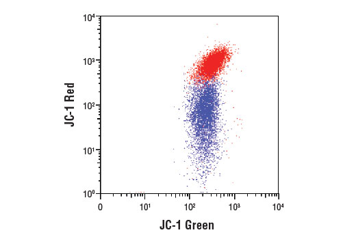 JC-1 (5,5′,6,6′-tetrachloro-1,1′,3,3′-tetraethyl-imidacarbocyanine iodide) is a cell membrane permeable, cationic dye. In normal cells, JC-1 concentrates in mitochondria to form aggregates in response to relatively high membrane potential. Decreased mitochondrial membrane potential results in dispersal of mostly monomeric JC-1 throughout the cell. When excited at 490 nm, JC-1 monomers emit a green fluorescence with a maximum at ~520 nm. Aggregates of JC-1 emit an orange-red fluorescence with a maximum at ~590 nm. Therefore, the fluorescence intensity of the orange-red emission and the ratio of orange-red fluorescence to green fluorescence can be used to measure mitochondrial membrane potential and serve as an indicator of overall cell health (4).