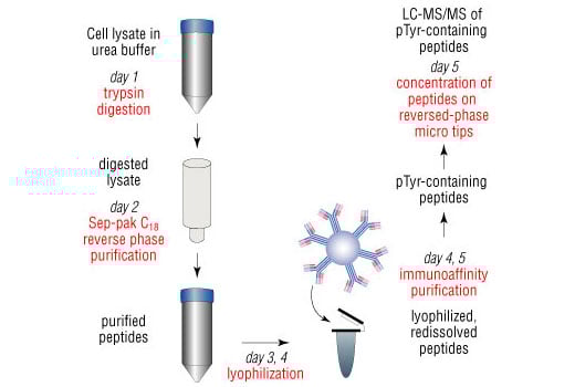 Tyrosine phosphorylation plays a key role in cellular signaling (2). In cancer, unregulated tyrosine kinase activity can drive malignancy and tumor formation by generating inappropriate proliferation and survival signals (3). PhosphoScan® Kit, based on CST's published method (1), isolates large numbers of cellular phosphotyrosine-containing peptides. This allows the investigator to obtain a global overview of tyrosine phosphorylation in the cell, covering many classes of proteins without preconceived biases about where tyrosine phosphorylation sites will be found.